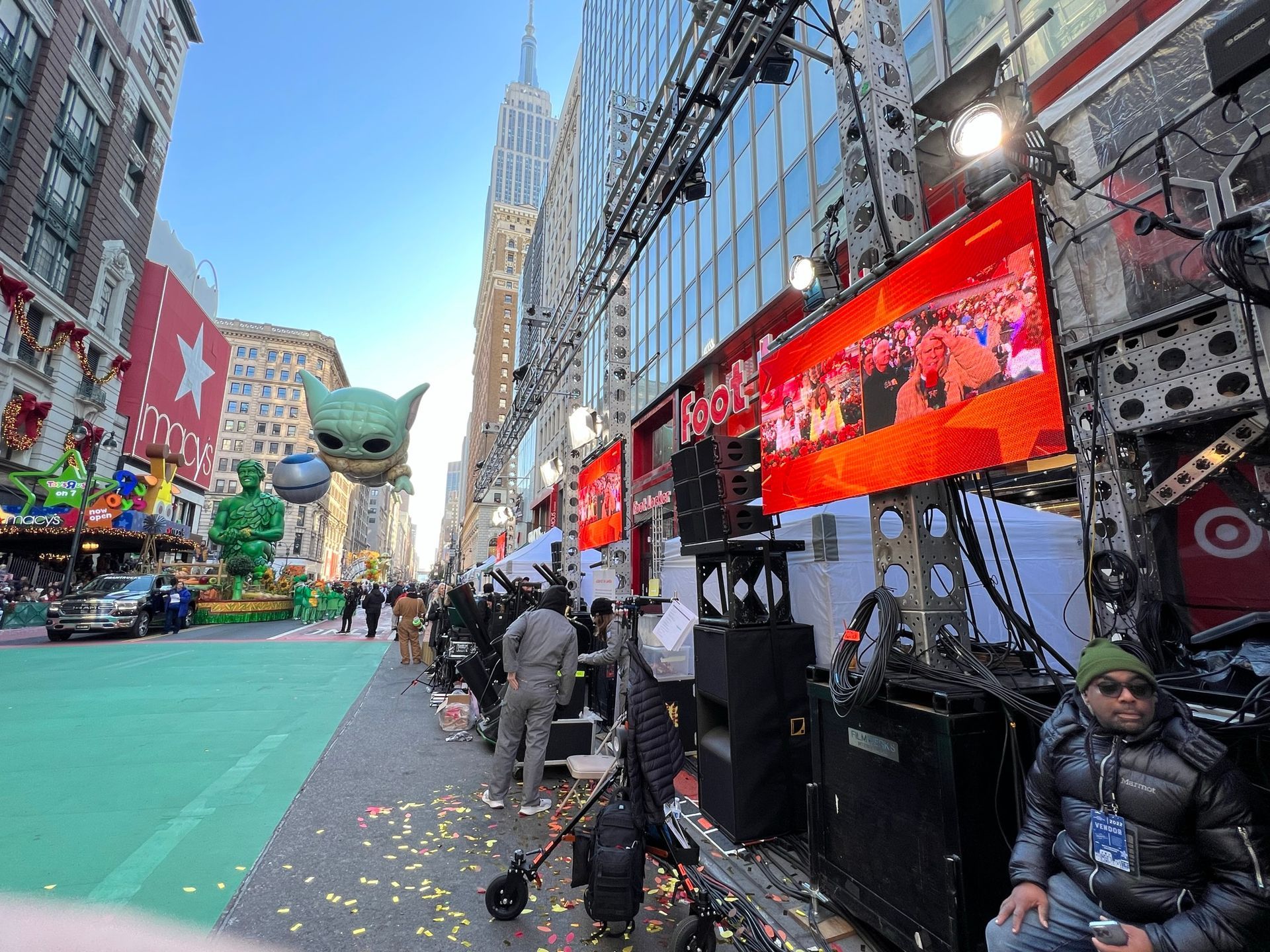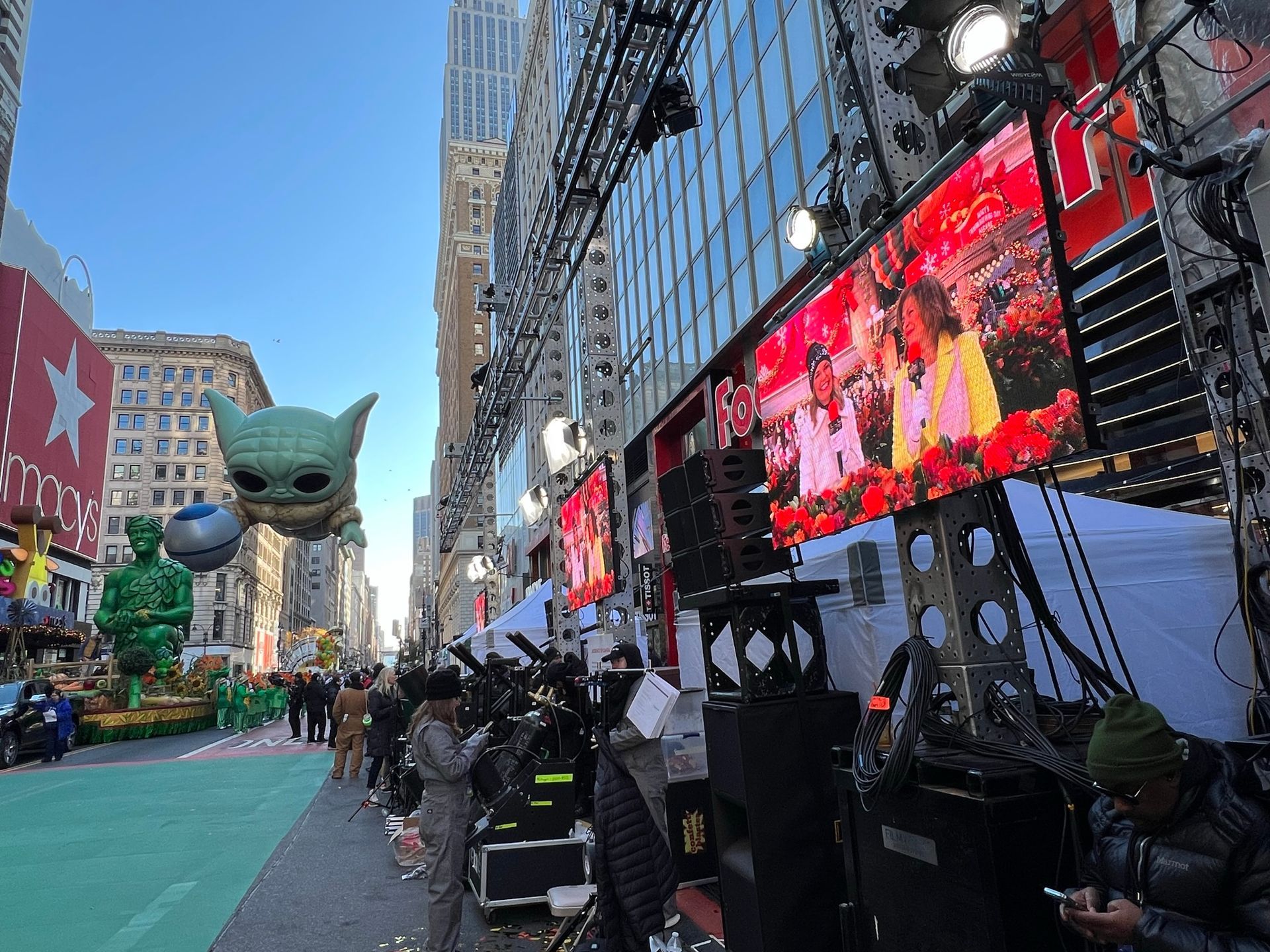 To ensure that performers—from dancers to marching bands—could see themselves during their televised segments, we strategically placed LED display panels both along the street and on parade floats. These confidence monitors played a crucial role in helping talent stay oriented and engaged during their performances for the NBC television broadcast. With real-time visual feedback, performers were able to stay in sync and deliver polished, camera-ready acts with confidence.